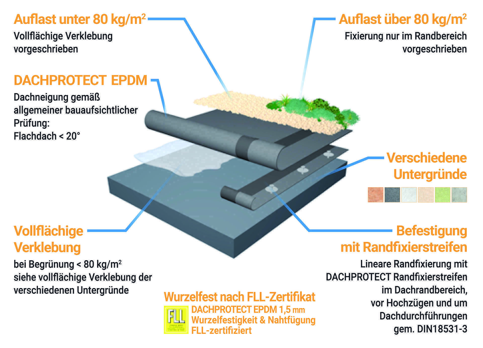 Das System DACHPROTECT verfügt über alle Prüfungen, Zulassungen und Zertifikate gemäß Flachdachrichtlinie des Dachdeckerhandwerkes. Weiterhin ist beim ZVDH eine Materialgarantie hinterlegt und Sie erhalten von uns eine 20-jährige Materialgarantie.
