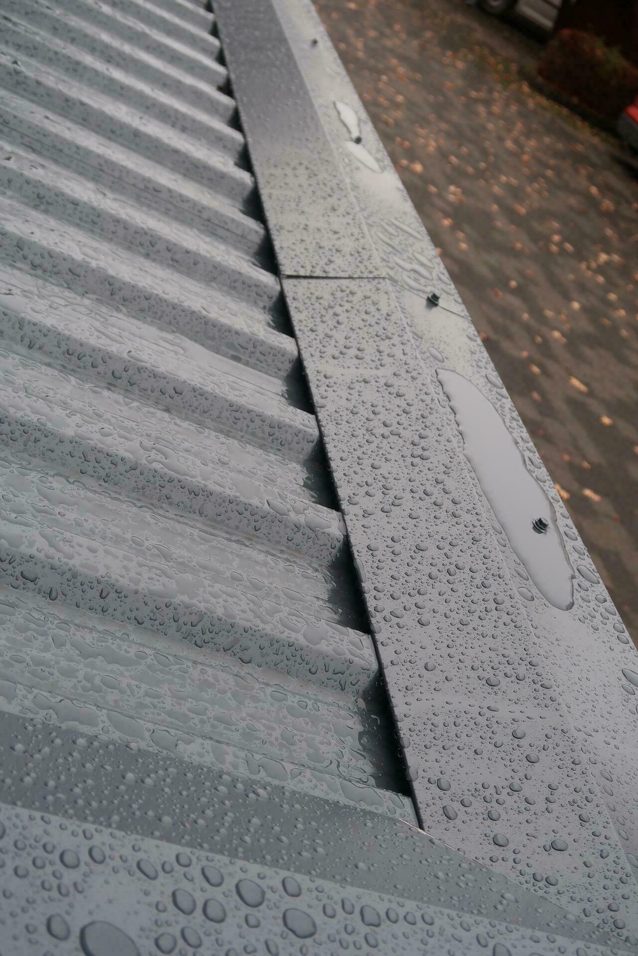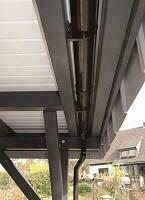 Inklusive Regenrinnen-Set aus Kunststoff dunkelgrau, inkl. Fallrohr, Bögen, Einhangbleche und Befestigungsmaterial.